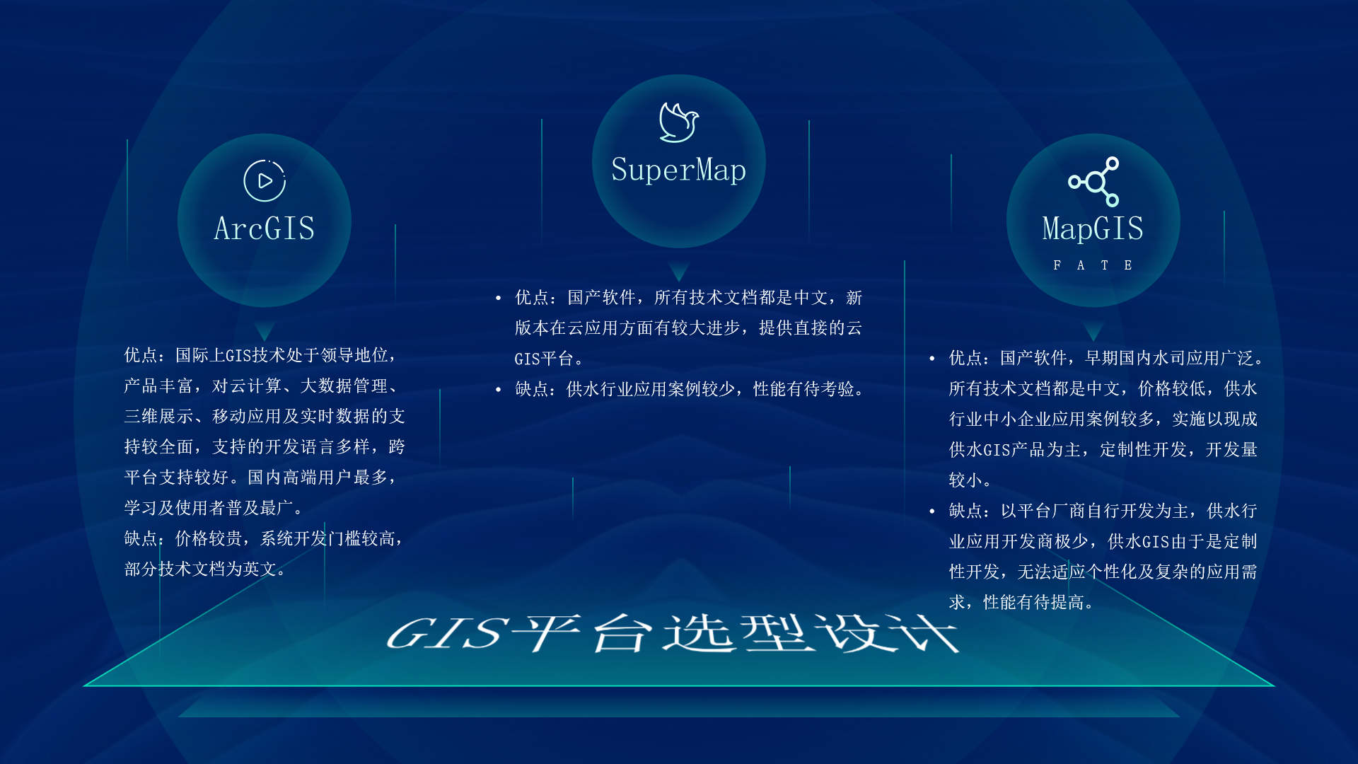 目前,国内外常用的GIS平台软件有很多,其中,市场中主流的GIS平台主要有以下三 种:SuperMap、MapGIS和ArcGIS。其中SuperMap和MapGIS是国产的GIS平台,分别是由北京超图软件股份有限公司和武汉中地数码集团研制。ArcGIS则是美国的产品,为ESRI公司所有。