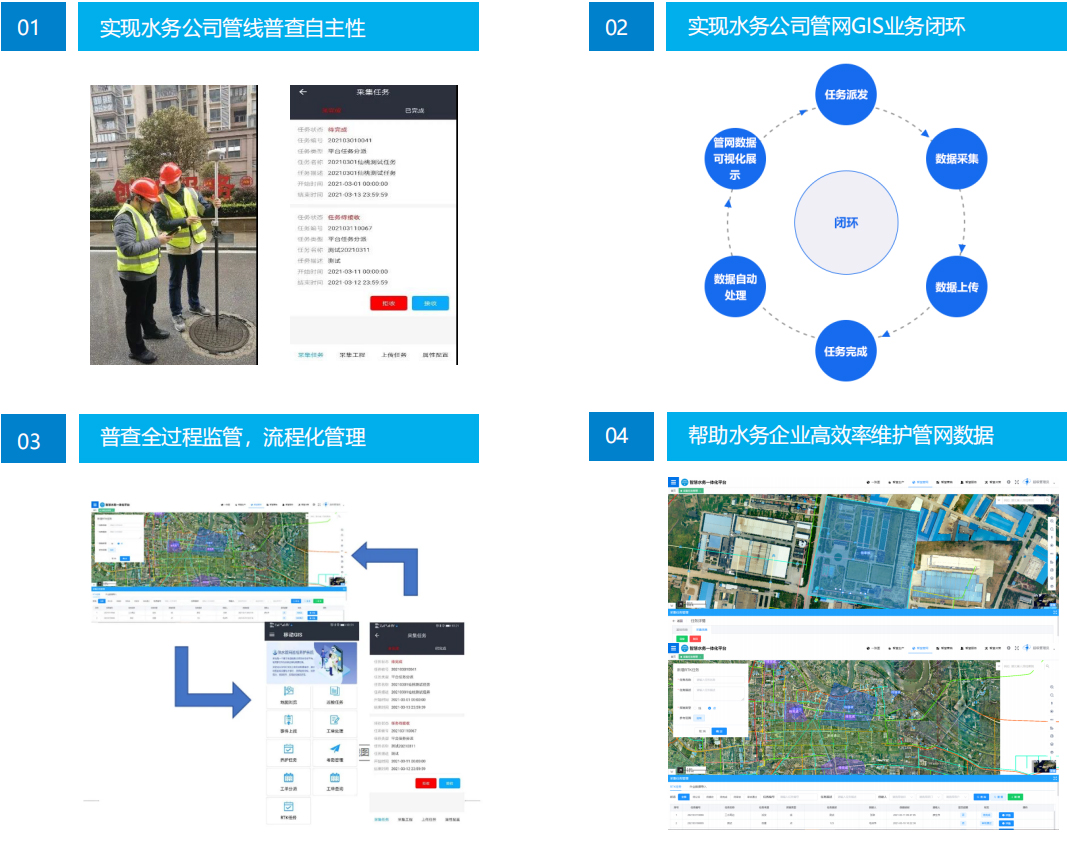 平台以PC端和移动端两大应用为窗口,端与端互通互连,从而快速、准确、及时将管网数据采集入库。