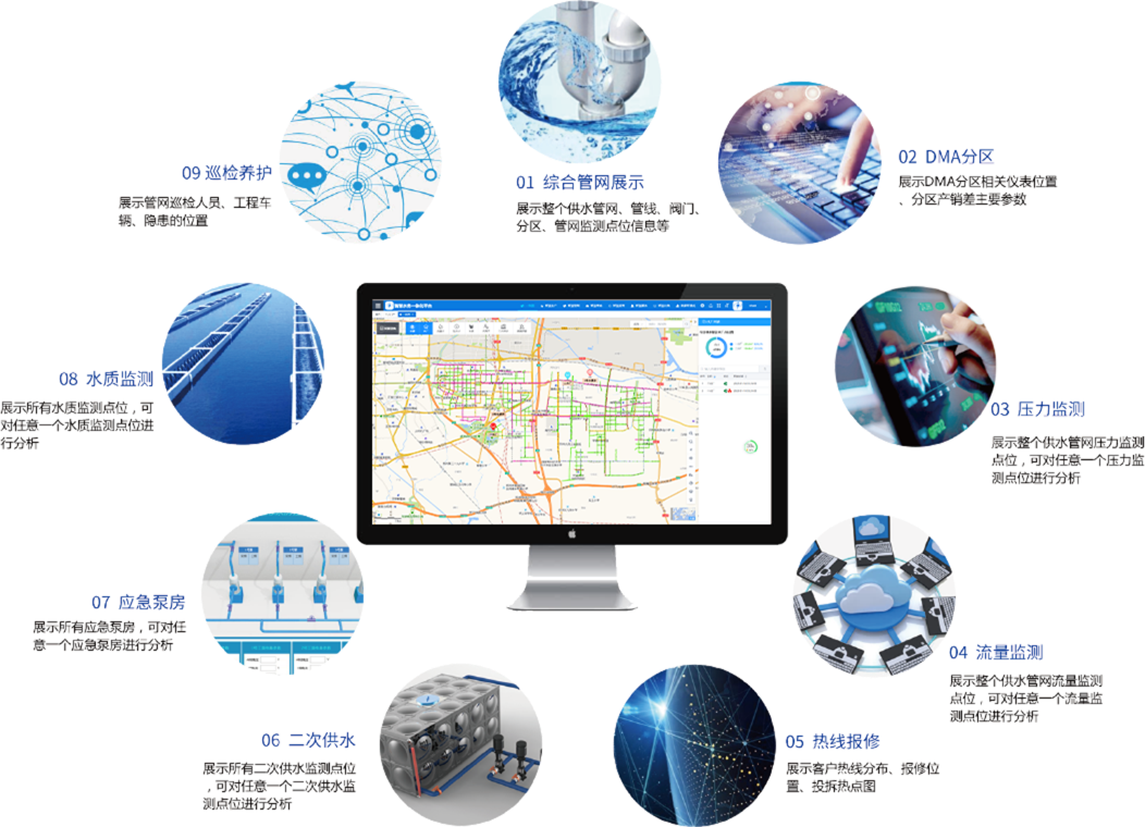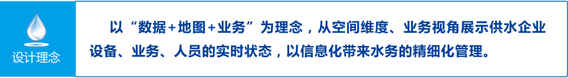 水务一体化管理对信息整合共享,有效支撑基础管理和公共服务提出了新的需求。按照“ 顶层设计、统一标准、资源整合、系统集成、共建共享、分级维护 ” 等原则,构建基于水务“一张图”的管理体系能够最大化提升水务核心数据库的利用率,实现对管网的压力、流量、水质、二次供水、DMA等供水设施的一体化全过程决策分析和实时监管,实现以信息化带动管理精细化,全面提升水务企业的行政效能。