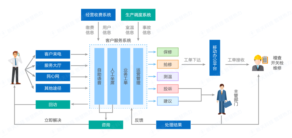 通过供热客服管理系统,建立一体化、多维度、多渠道的客户服务管理平台。统一的服务标准、规范的服务流程、完善的考核体系,供热服务直观展现、供热质量图形分析、供热舆情及时提醒等等,实现全方位的用户诉求的接单、派单、督办、回访等全过程,确保工单形成闭环,确保工单不丢失、不重复、不延误。具备卓越的话务功能、完善的业务处理功能,包括咨询、报修、抢修、测温、投诉、建议等功能,提高客服部门协作效率,提升服务能力。