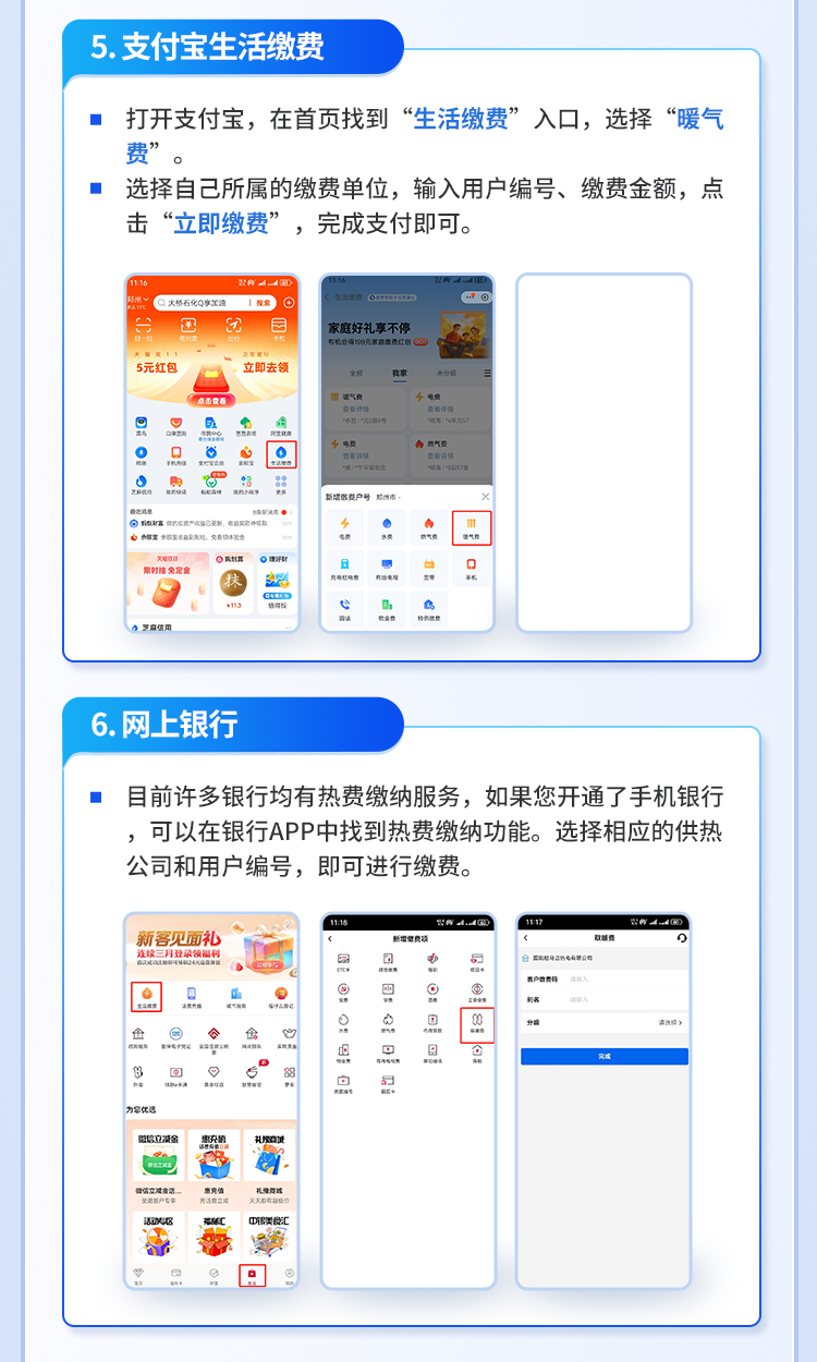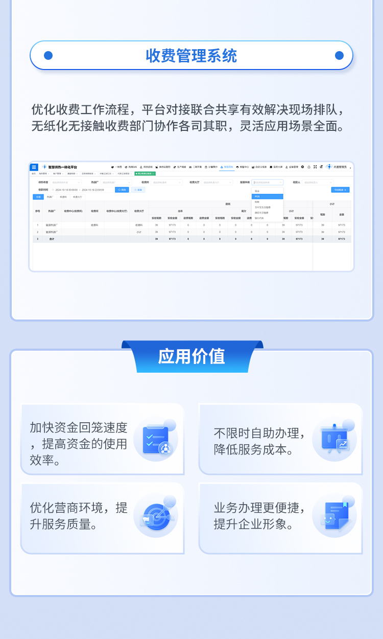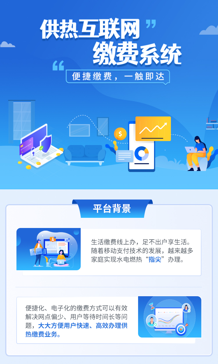 借助"互联网+"等新兴技术,缴费系统实现了各商业银行及微信、支付宝、银联云闪付等主流第三方支付平台的多种渠道代收热费的功能,方便热用户在收费高峰期根据自身实际情况,选择较为方便的便捷缴费渠道,完成缴费业务,极大增强用户服务体验。