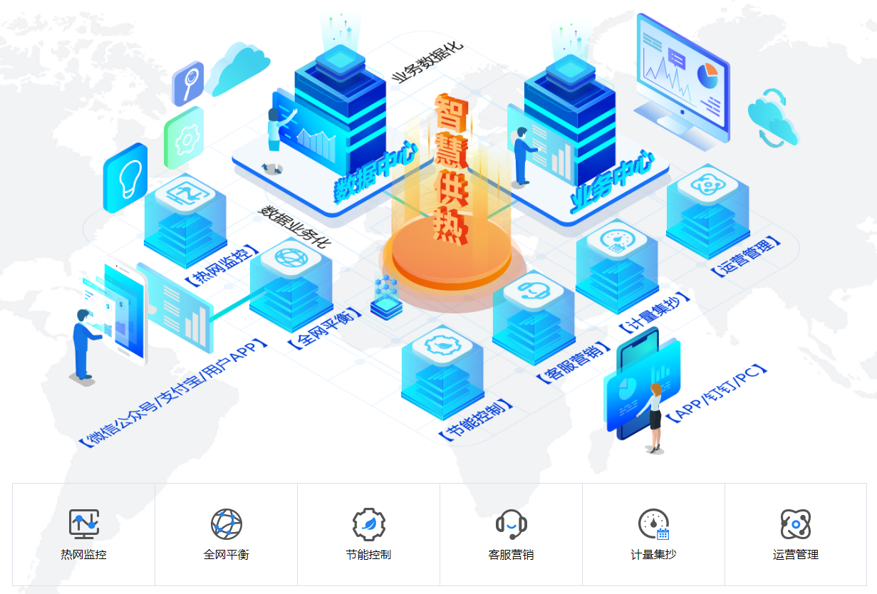 智慧供热一体化平台:包含:热网监控、全网平衡、节能控制、客服营销、计量集抄,运营管理六个板块。