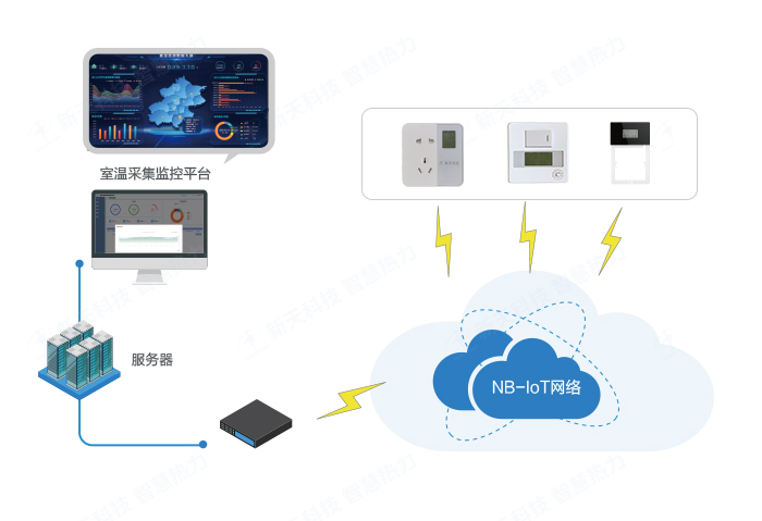 室温采集监测系统,是通过室温监测设备实时采集用户室内温度、湿度,采用NB-IoT通讯方式,数据直接上传至云平台,实现对用户室温的远程监测,对全网室温进行分析,获取住户均温分布数据、室温达标率、设备抄通率等信息,为热企及时掌握不同区域的供热质量,实施热网负荷优化调整提供可靠的依据。为热企平衡调节、控制能耗提供数据支撑,指导按需供热调节,促进节能减排。