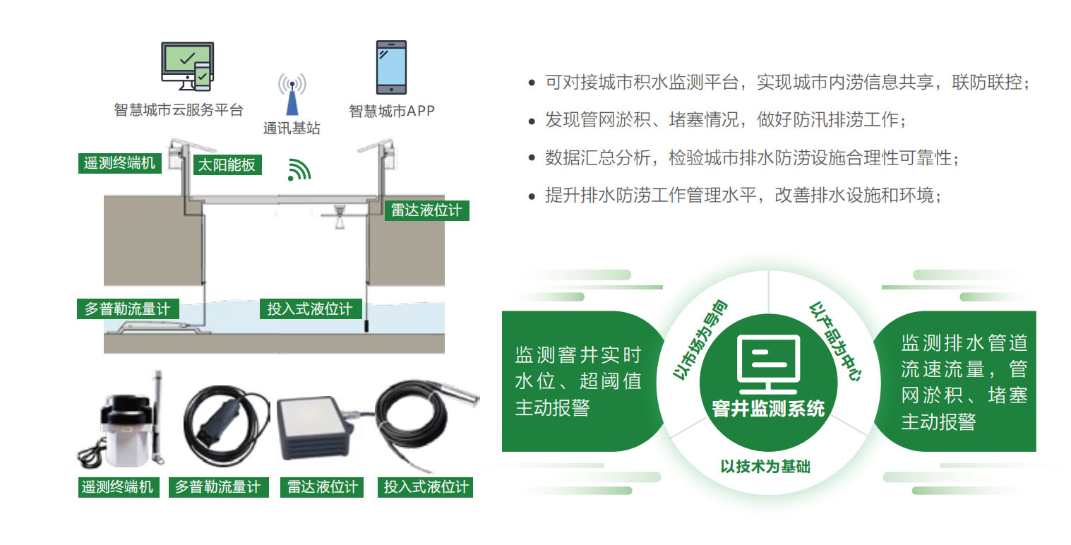 系统由遥测终端机、液位计、多普勒流量计等设备组成,集水位监测、流量监测、实况预警等功能于一体。对窨井水位、流量实时监测,实时掌握排水管网状况,及时发现管网淤积、堵塞。通过系统平台数据统计分析,预警,辅助监管人员进行日常排水管网运维和汛期排涝工作,提高城市排水监控、运维养护、和防汛应急处置能力。